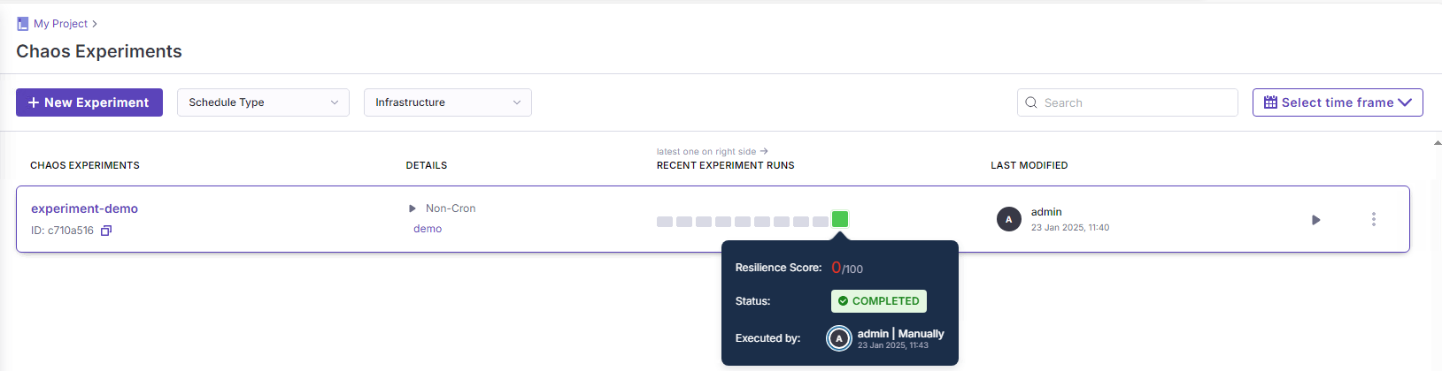 After scheduling a chaos experiment, a user can view the details of the running chaos experiment from the ChaosCenter. ChaosCenter provides a real-time graph that is used to visualize the chaos experiment and get the details of individual steps of the chaos experiment. Important details like the logs and target applications can be viewed from ChaosCenter. Once the chaos experiment execution is completed, the resiliency score is calculated and the ChaosResult for the ChaosEngine pods is available.