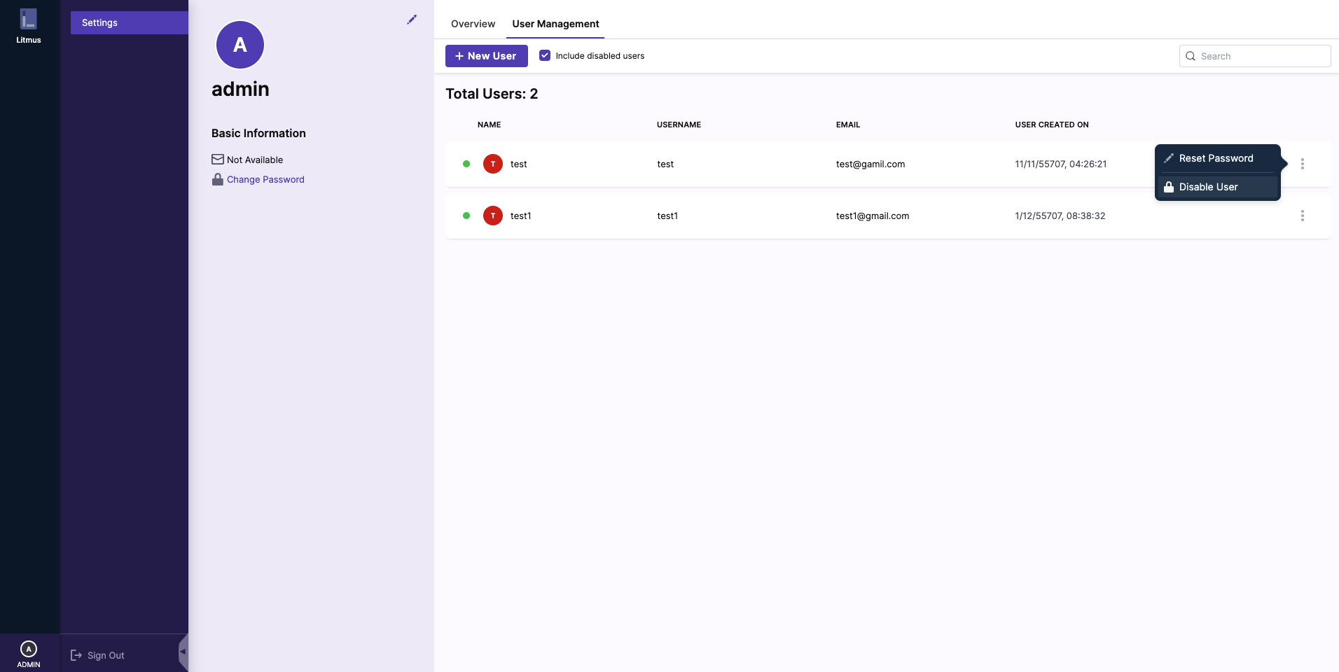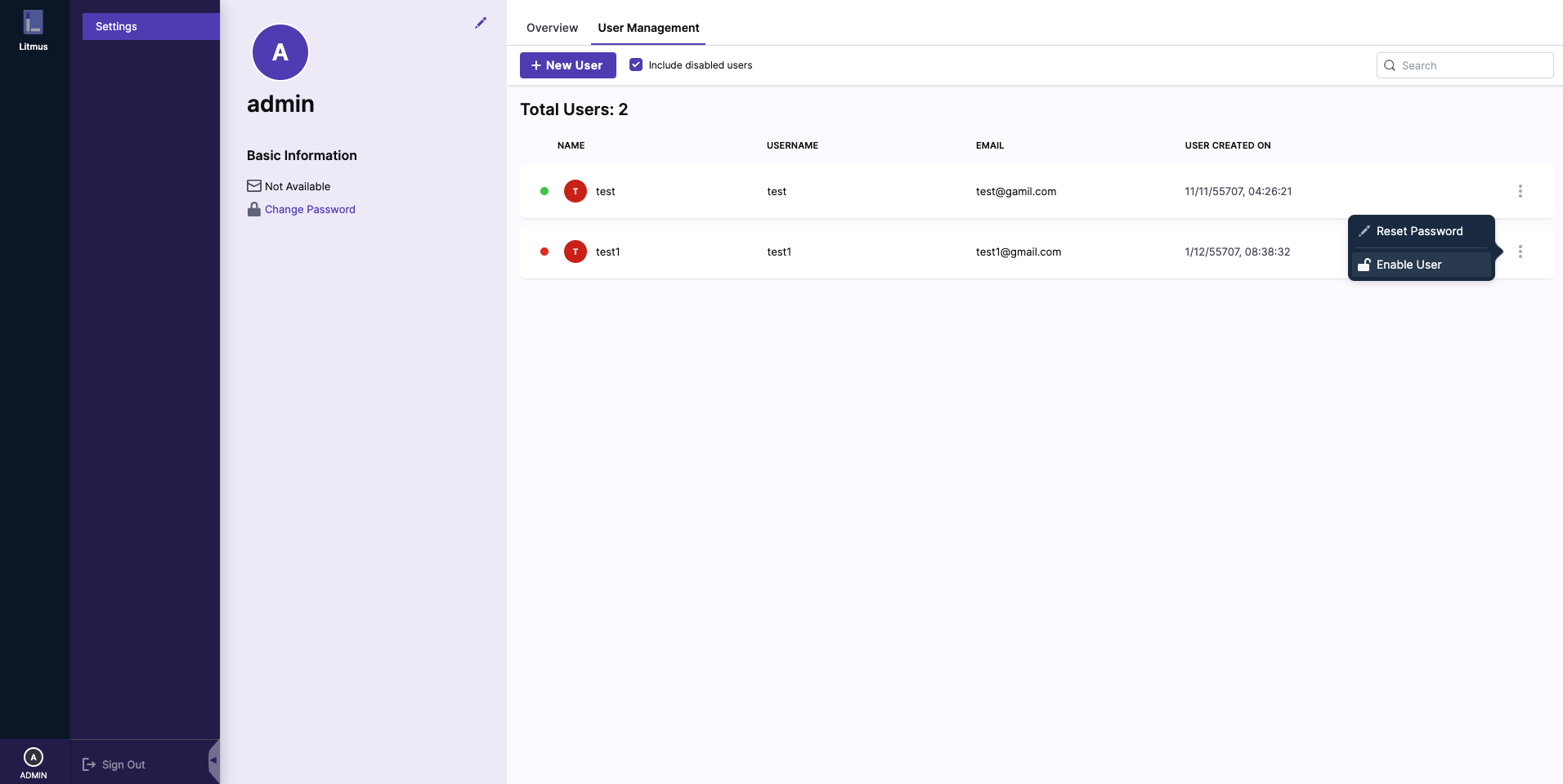 Similarly, the admin user can re-activate the user from the same drop-down menu as shown: