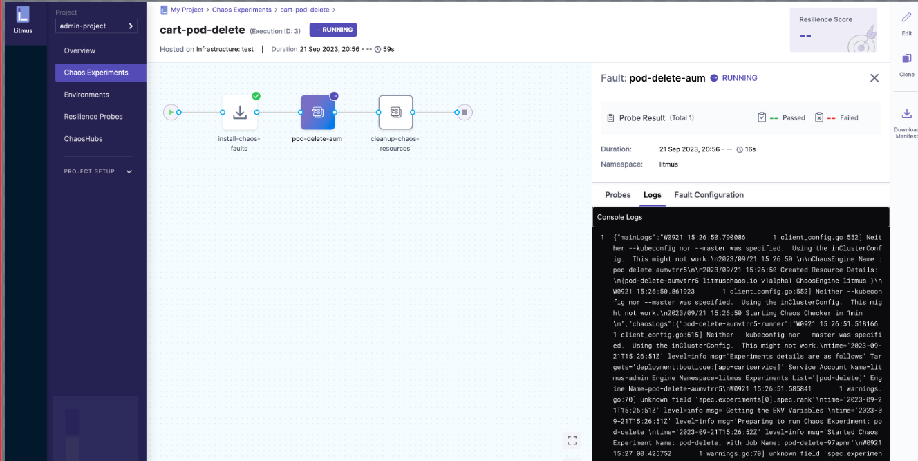 After scheduling a chaos experiment, a user can view the details of the running chaos experiment from the ChaosCenter. ChaosCenter provides a real-time graph that is used to visualize the chaos experiment and get the details of individual steps of the chaos experiment. Important details like the logs and target applications can be viewed from ChaosCenter. Once the chaos experiment execution is completed, the resiliency score is calculated and the ChaosResult for the ChaosEngine pods is available.