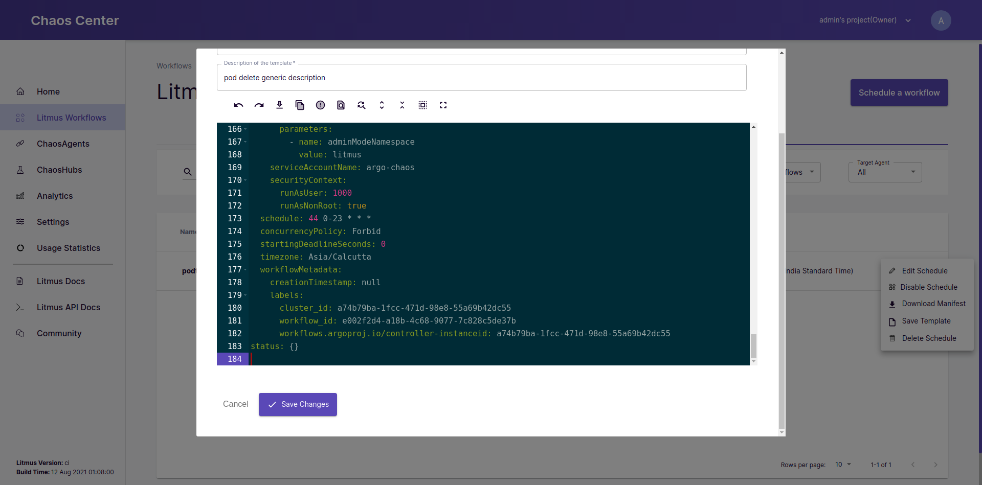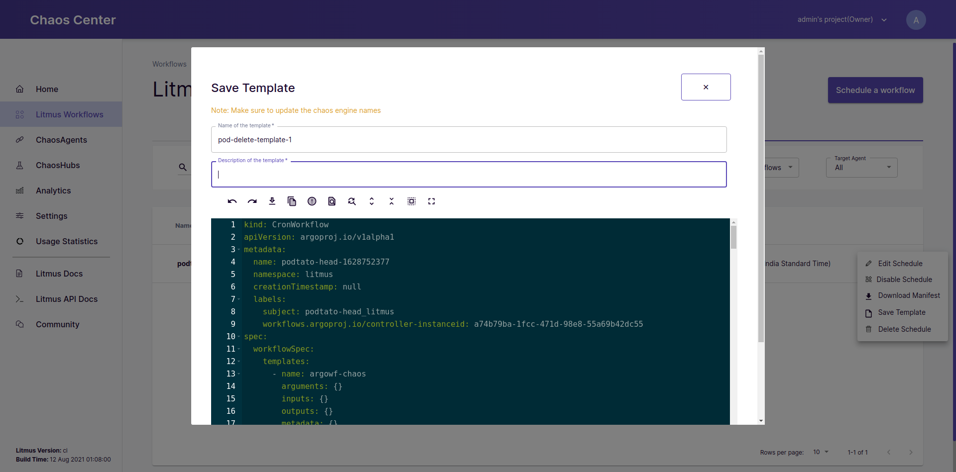 After opening the options menu, click on the Save Template option. You will see the following modal popup. Here you can edit the chaos scenario YAML and provide a name and description for the template you are creating:
